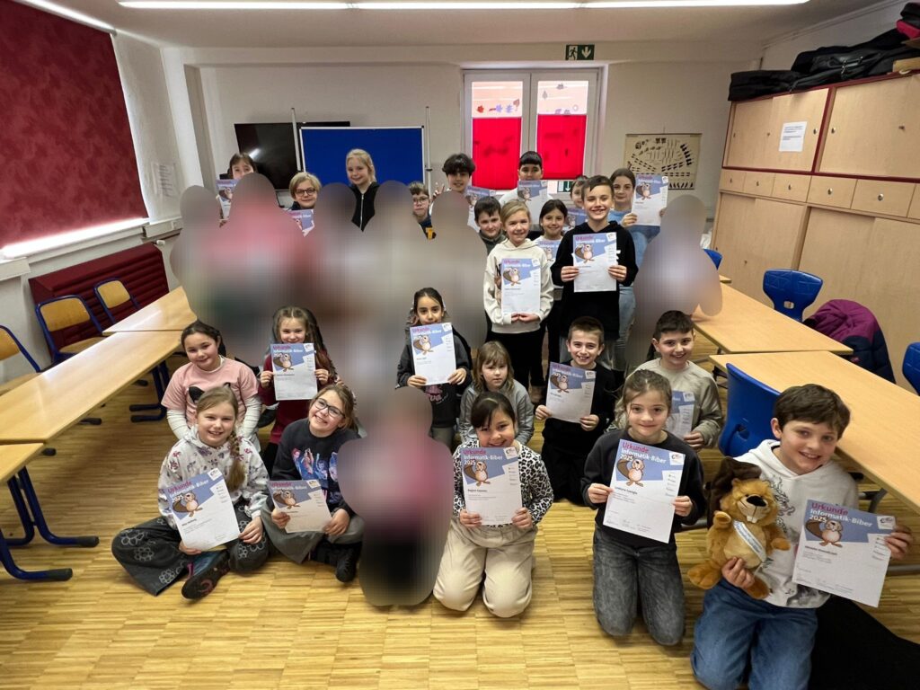 Alle Kinder bekamen Urkunden. Darüber hinaus gab es ein Plüschbiber für die erste Teilnahme, viele Anerkennungsplatzierungen und sogar drei dritte Plätze. Die Siegerehrung nahm Frau Brauckmann-Mai am Mittwoch, den 04.02.2026, in der vierten Stunde vor. Wir gratulieren!
